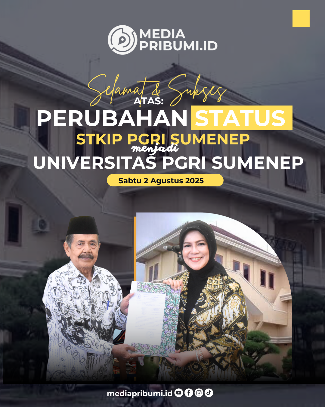 Mediapribumi.id, Sumenep — Sekolah Tinggi Keguruan dan Ilmu Pendidikan (STKIP) PGRI Sumenep resmi beralih status menjadi Universitas PGRI Sumenep. Perubahan tersebut tertuang dalam Salinan Keputusan Menteri Pendidikan Tinggi, Sains, dan Teknologi Republik Indonesia Nomor 605/B/0/2025.